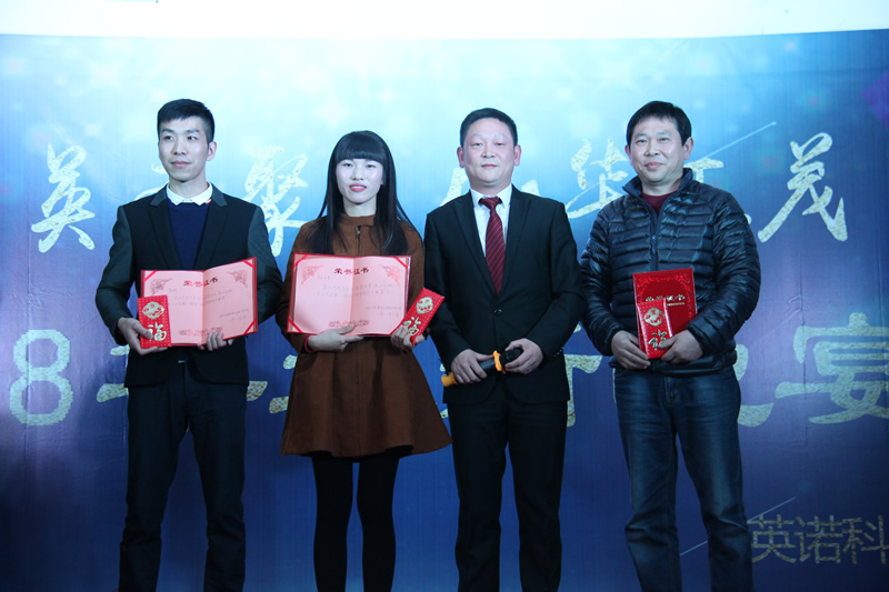 ▲五周年特別貢獻獎 由董事長程總頒發證書及獎金 授予榮譽人員:陳斌、林水英、程琥(從左至右排序)